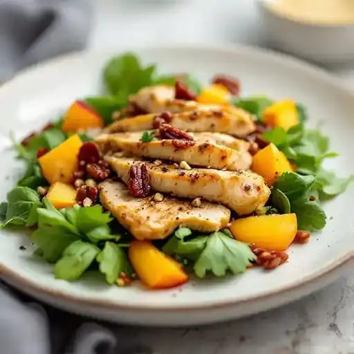 Chicken, peach, pecans, honey lime vinaigrette salad