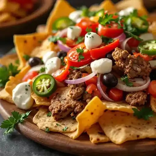 Pita chips, gyros meat, tomatoes, onions, peppers, mozzarella, sliced olives, feta cheese and jalapenos.