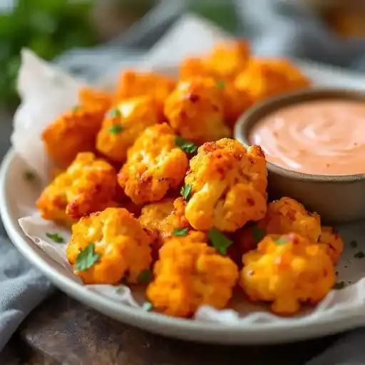 Spicy cauliflower bites served with dipping sauce.