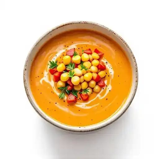 A creamy bisque featuring sweet roasted red peppers, succulent crab meat, and fresh corn, creating a delightful blend of flavors in every spoonful.
