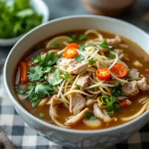 Aromatic broth with rice noodles, shredded chicken, herbs, and lime.