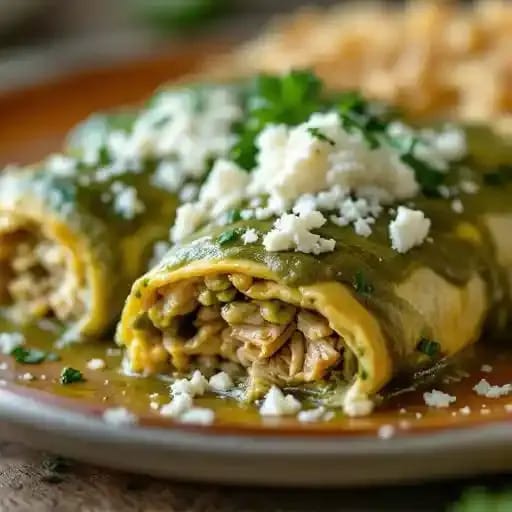 Indulge in our Enchiladas Verdes, featuring tender corn tortillas filled with savory shredded chicken, smothered in a zesty green tomatillo sauce, and topped with a sprinkle of fresh cilantro and crumbled queso fresco.