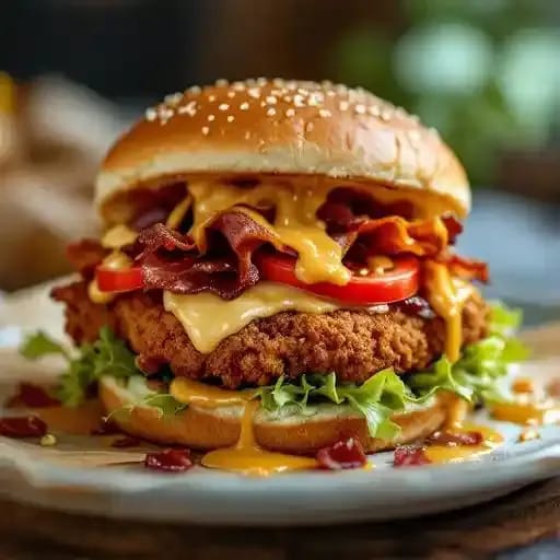 Crispy chicken sandwich with roasted garlic & honey mustard glaze, gruyere, bacon, lettuce, tomato, mayo.