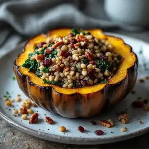 Baked squash filled with wild rice, cranberries, pecans, and herbs.