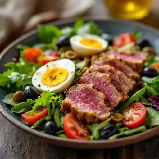 Experience the vibrant flavors of our Salad Nicoise, a classic French dish that beautifully combines tender greens, ripe tomatoes, crisp green beans, and briny olives, all topped with succulent seared tuna and hard-boiled eggs.