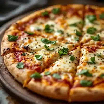 A delicious pizza topped with a blend of ricotta, parmesan, mozzarella, and fontina cheeses.