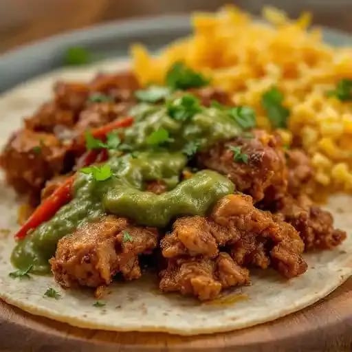 Carnitas cooked with green tomatillo sauce and salsa verde. Served with rice, beans and flour tortillas