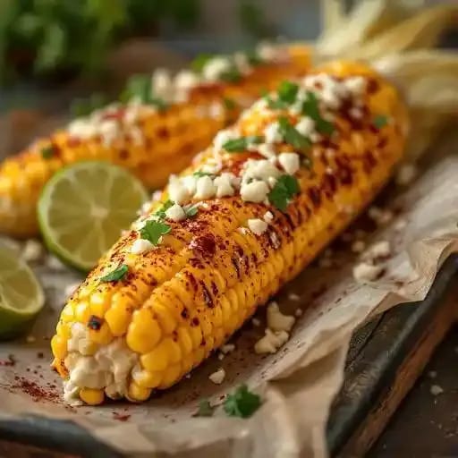 Experience the bold flavors of grilled corn on the cob, topped with zesty lime, creamy cotija cheese, and a sprinkle of chili powder for a delicious street-style treat.
