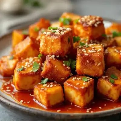 Crispy tofu tossed in a sweet and spicy sauce, sprinkled with toasted sesame seeds.