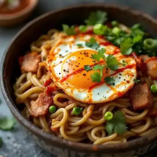Stir fry udon noodles- kimchi, onion, cabbage, pork belly & a sunny egg in a spicy savory sauce
