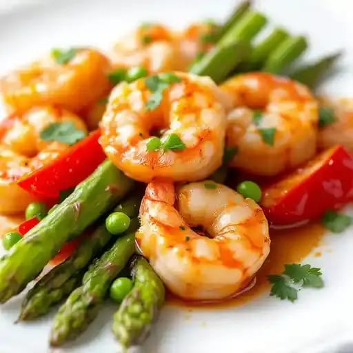Juicy shrimp sautéed with fresh asparagus in a fragrant garlic butter sauce.