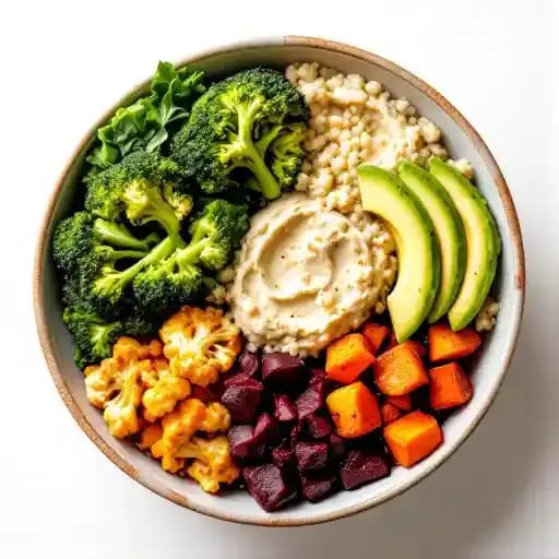 A nourishing bowl of roasted veggies, creamy hummus, and whole grains for a balanced, plant-based meal.