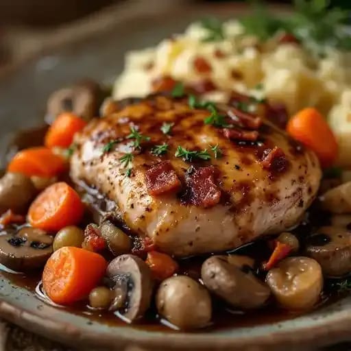 Airline chicken breast, pearl onion, carrots, bacon, mushrooms, stewed in red wine. Served with creamy mashed potatoes.