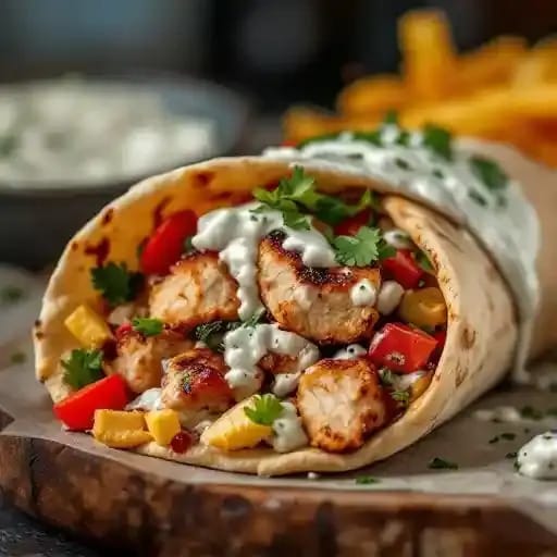 Signature marinated chicken, wrapped in toasted pita, topped with our homemade tzatziki sauce and served with side of fries.