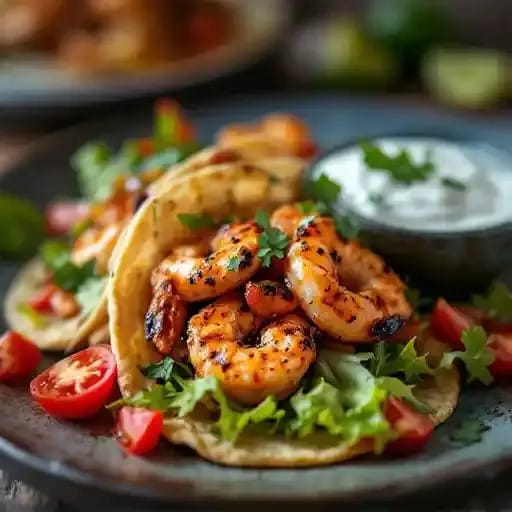 Tender blackened shrimp in tortillas with veggies and a zesty crema.