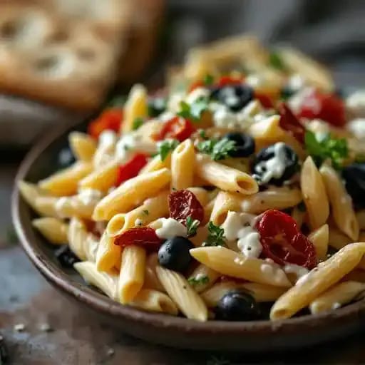 Penne pasta with sun-dried tomatoes, black olives, parmesan cheese, and creamy Greek dressing.