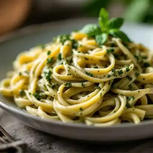 Fettuccine tossed with a creamy pesto sauce.