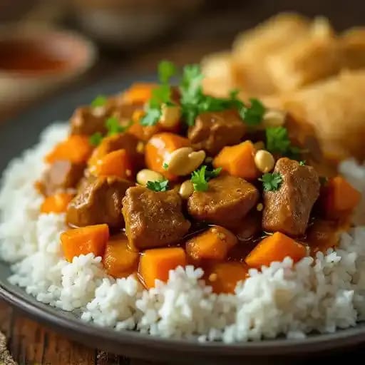 Masaman curry, peanut, sweet potatoes and served with rice.