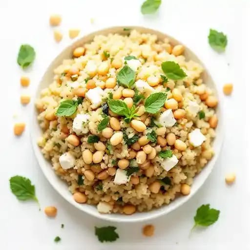 Couscous mixed with mint, feta, and pinenuts.