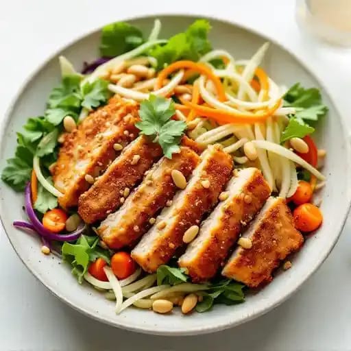 Crispy panko-breaded chicken served over fresh greens with a tangy sesame dressing for a delightful crunch in every bite.